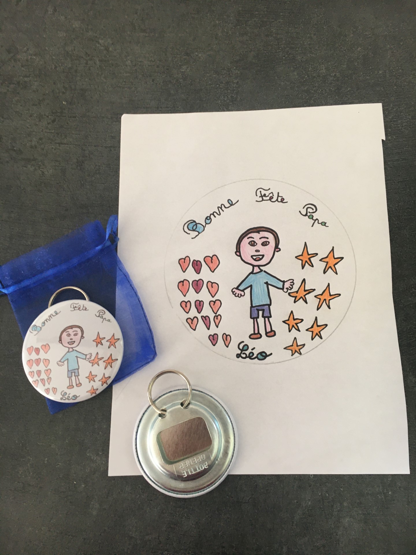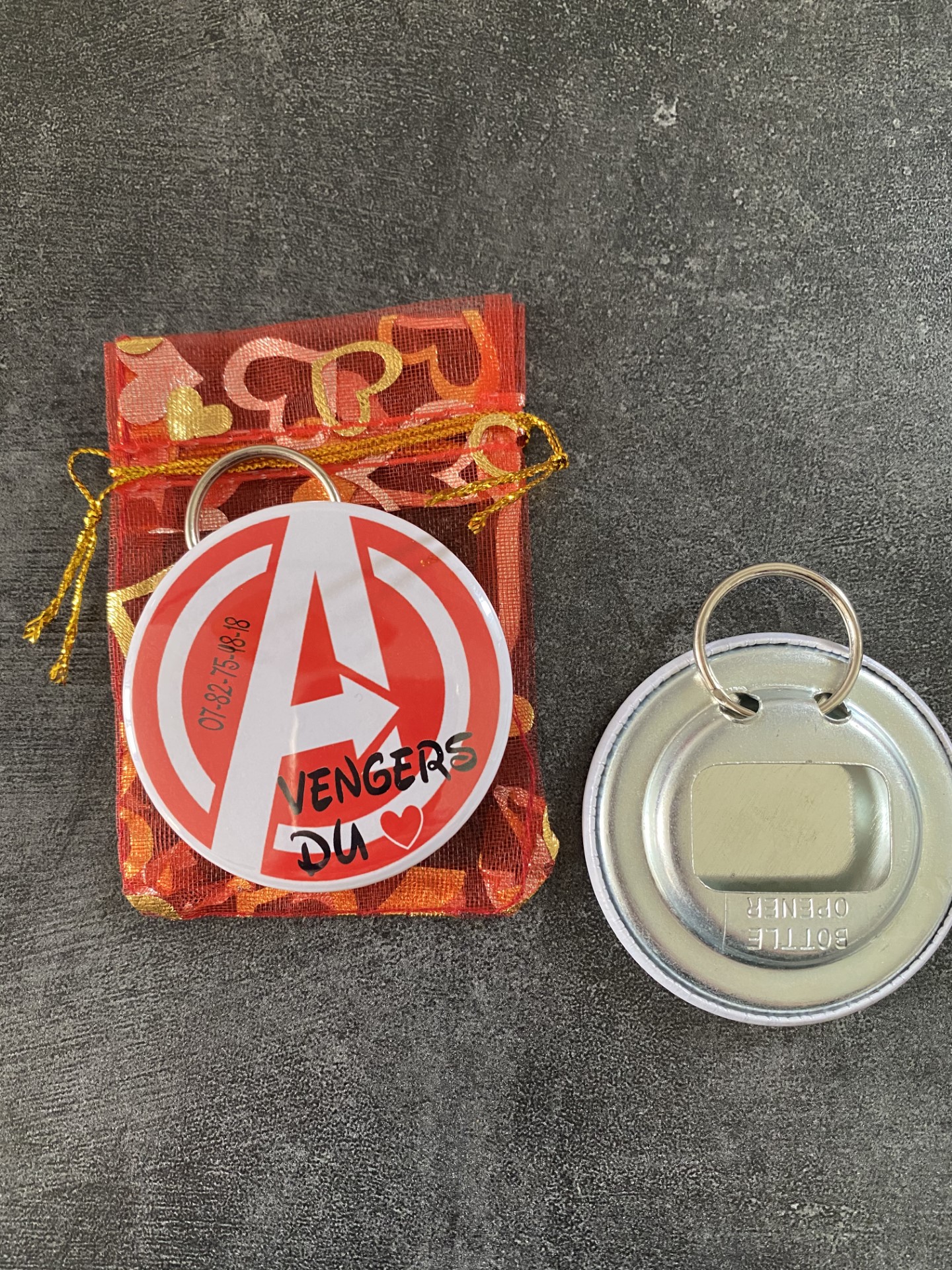 Joli badge porte clef décapsuleur avec son pochon.