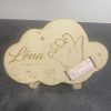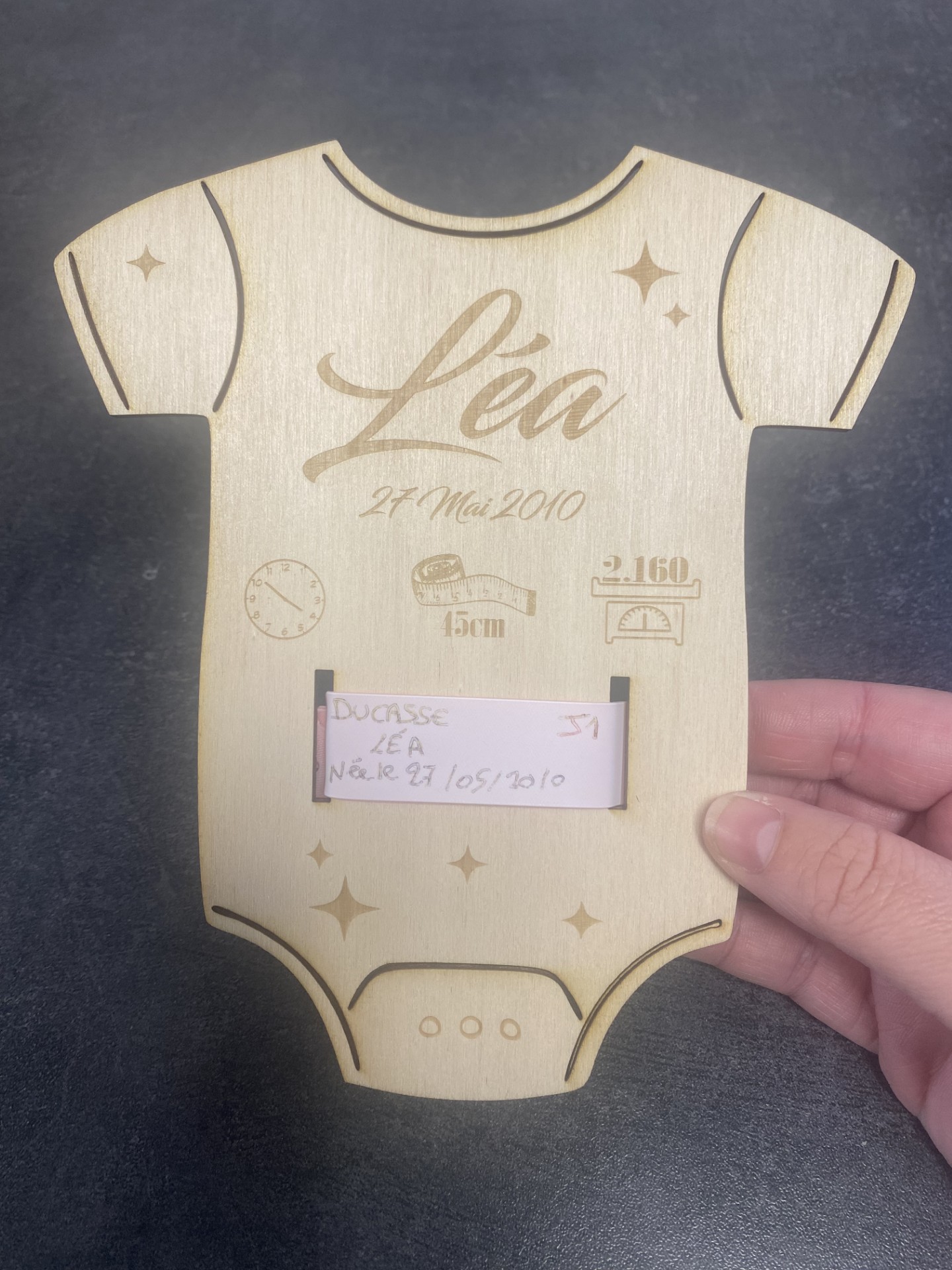 Un joli souvenir de naissance avec le prénom du bébé, la date de naissance, la taille, le poids, l’heure et accrocher son bracelet de naissance.