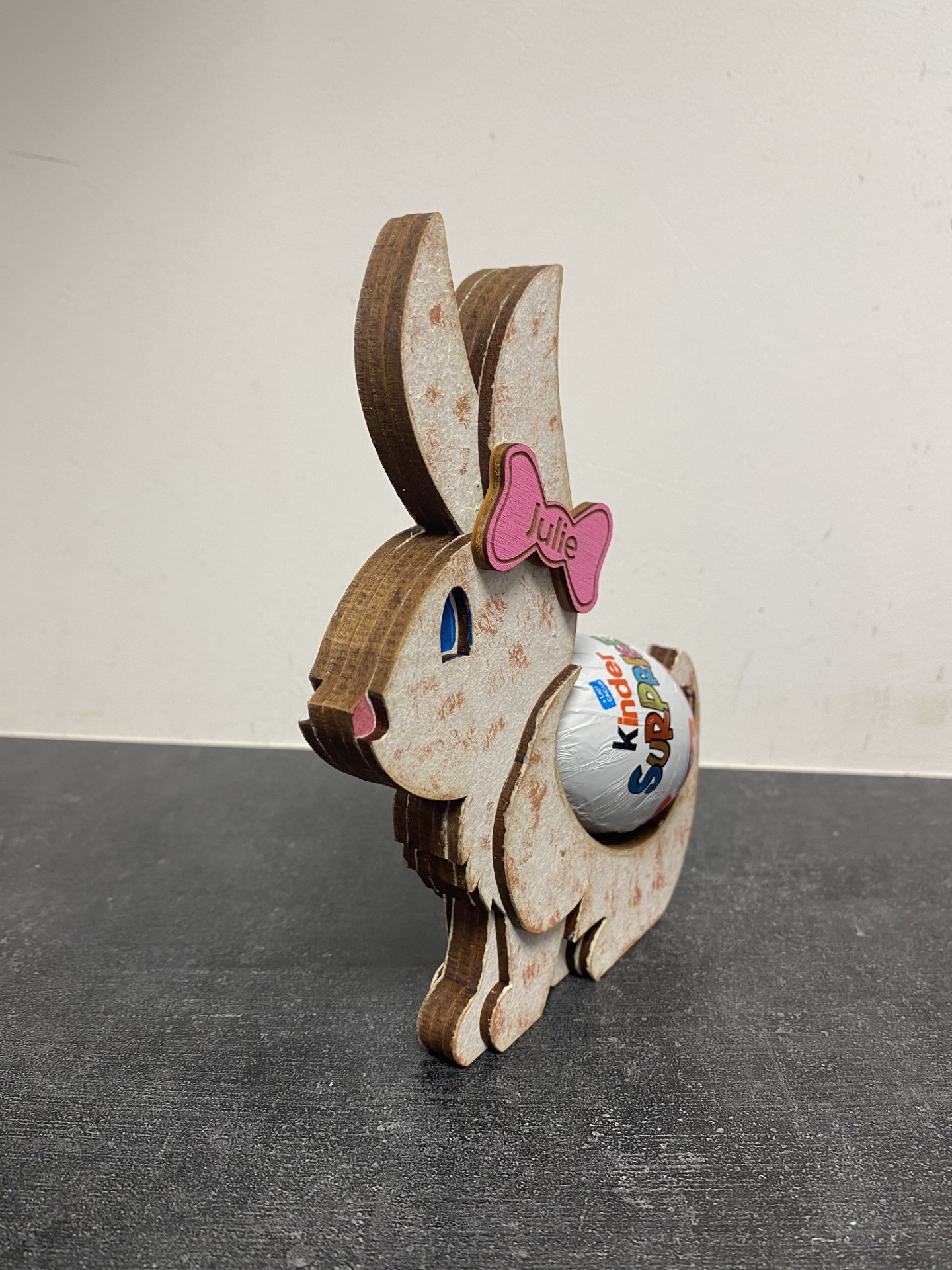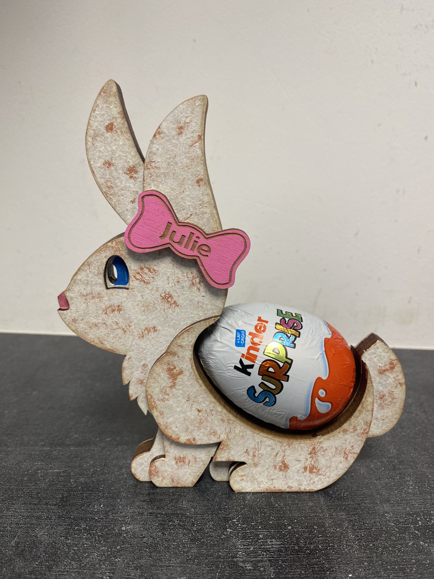 Un joli lapin qui porte un Kinder Surprise.