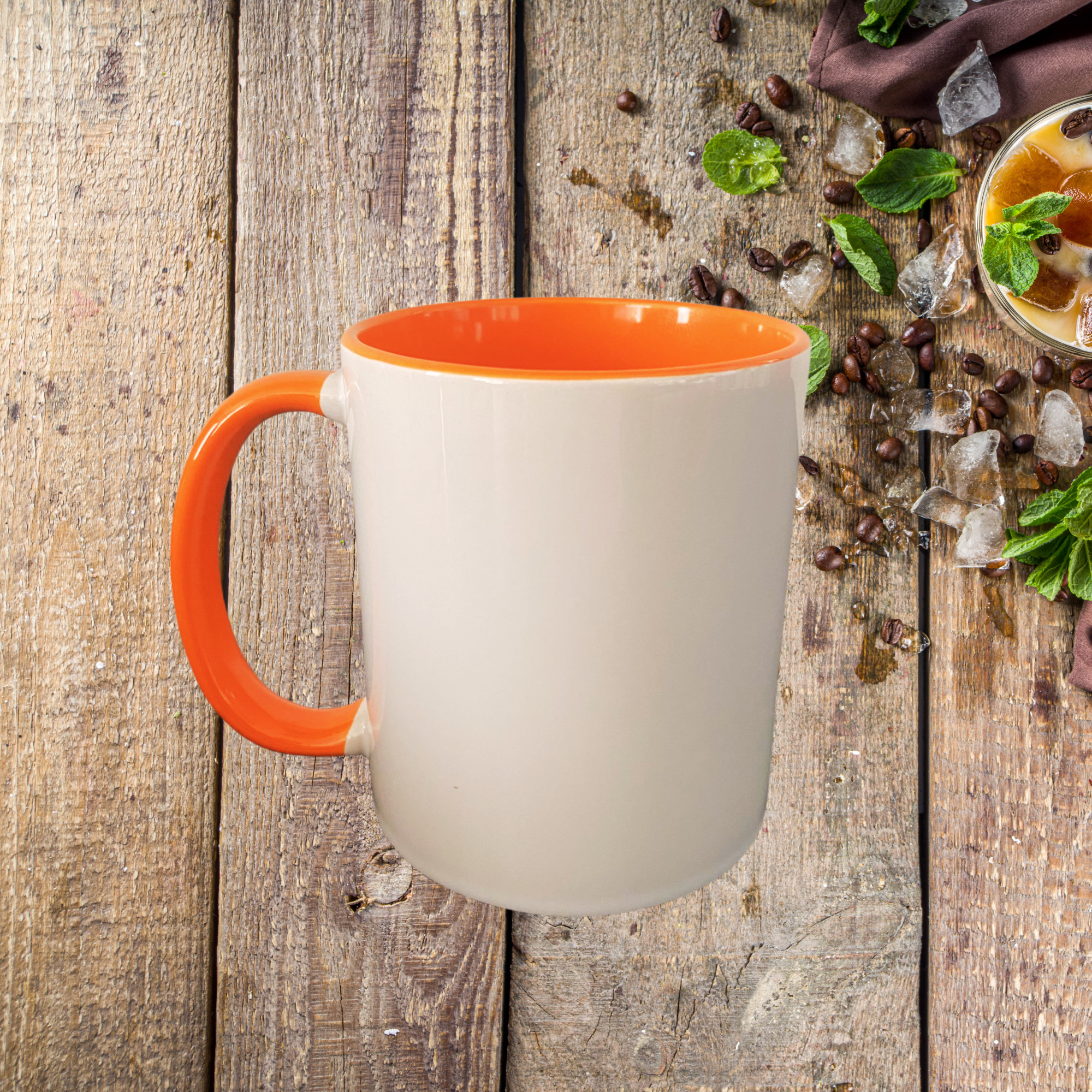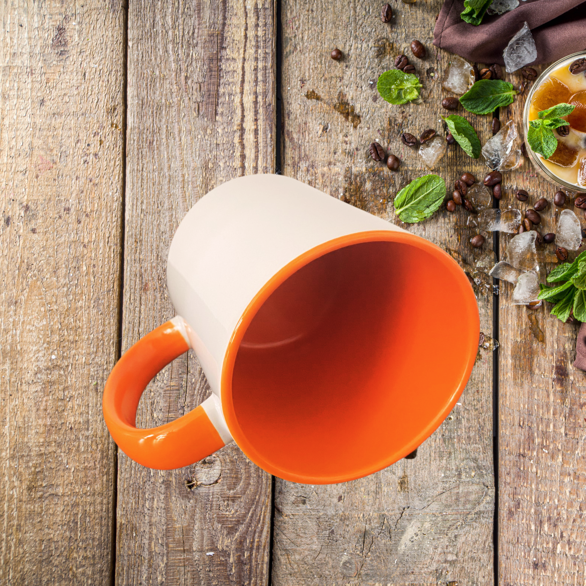 Mug intérieur & anse orange sur lequel vous pouvez ajouter votre photo, image ou texte.