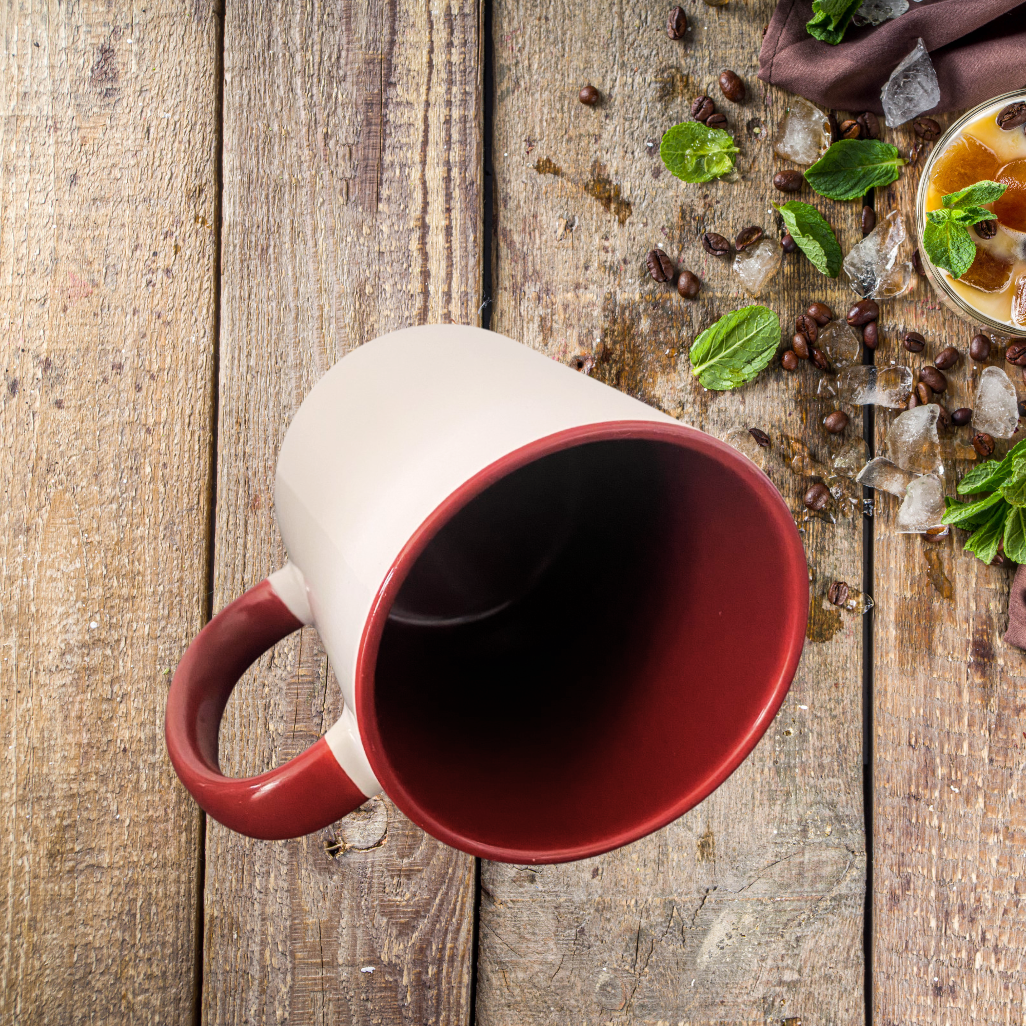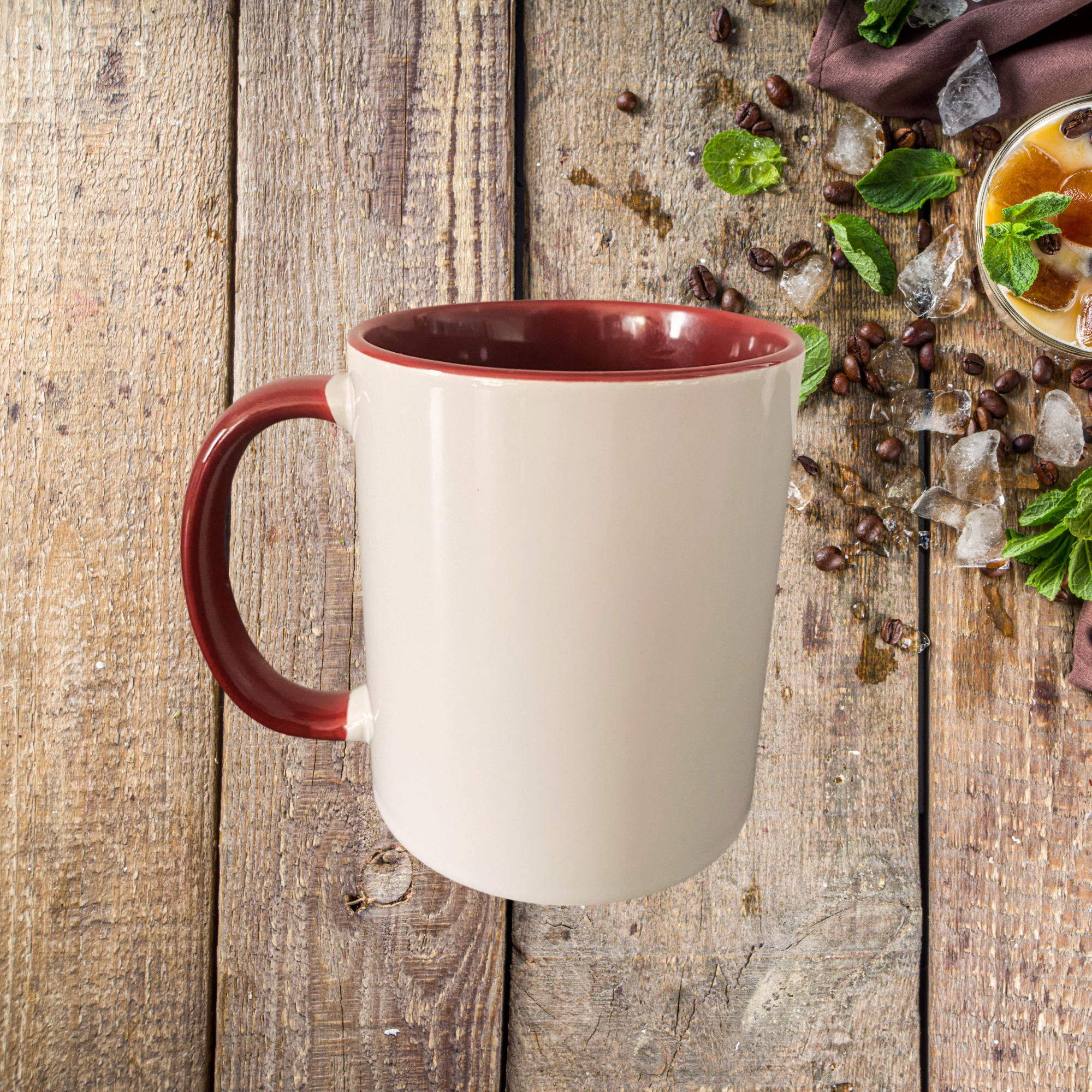 Mug intérieur & anse bordeaux sur lequel vous pouvez ajouter votre photo, image ou texte.