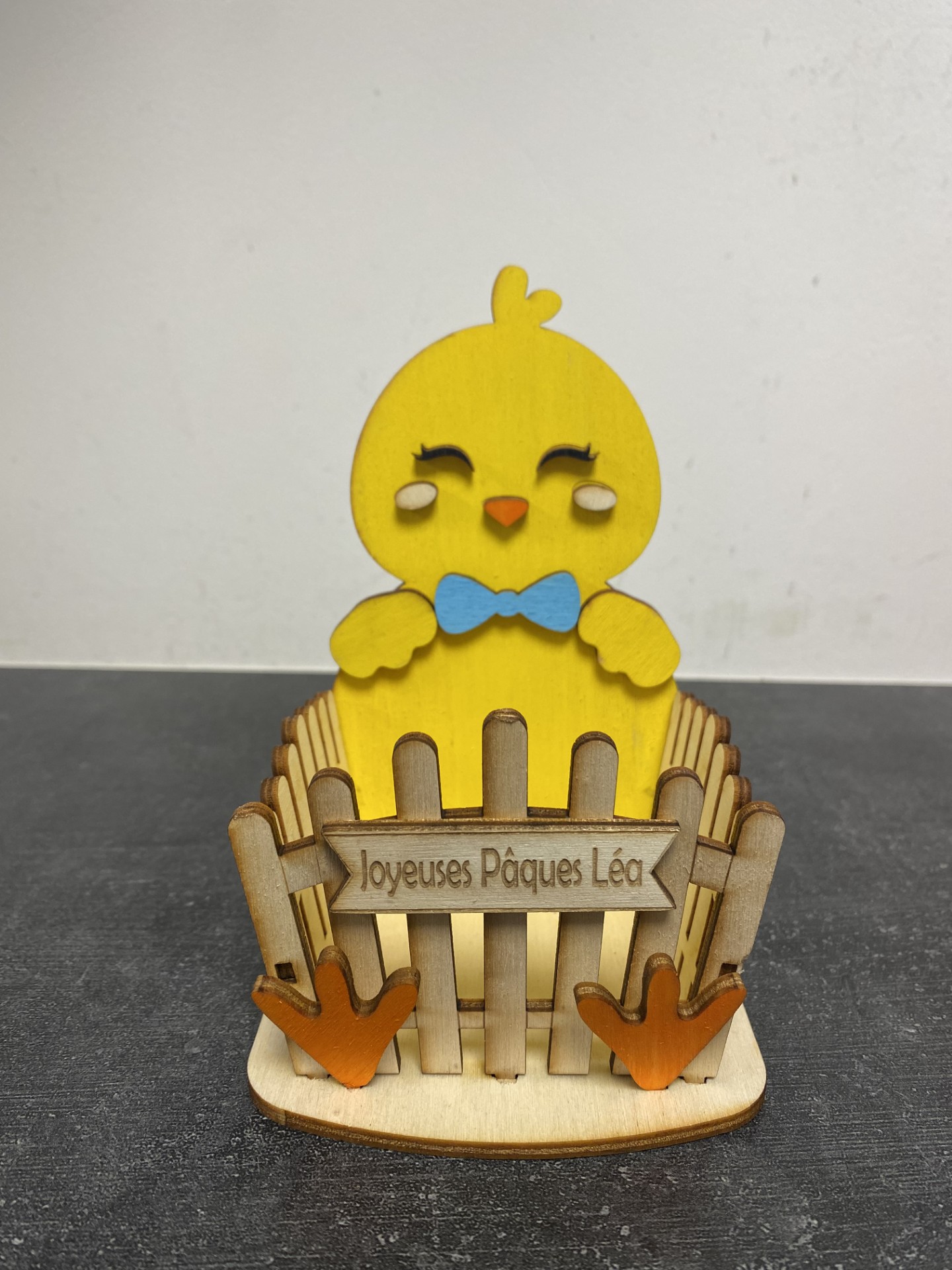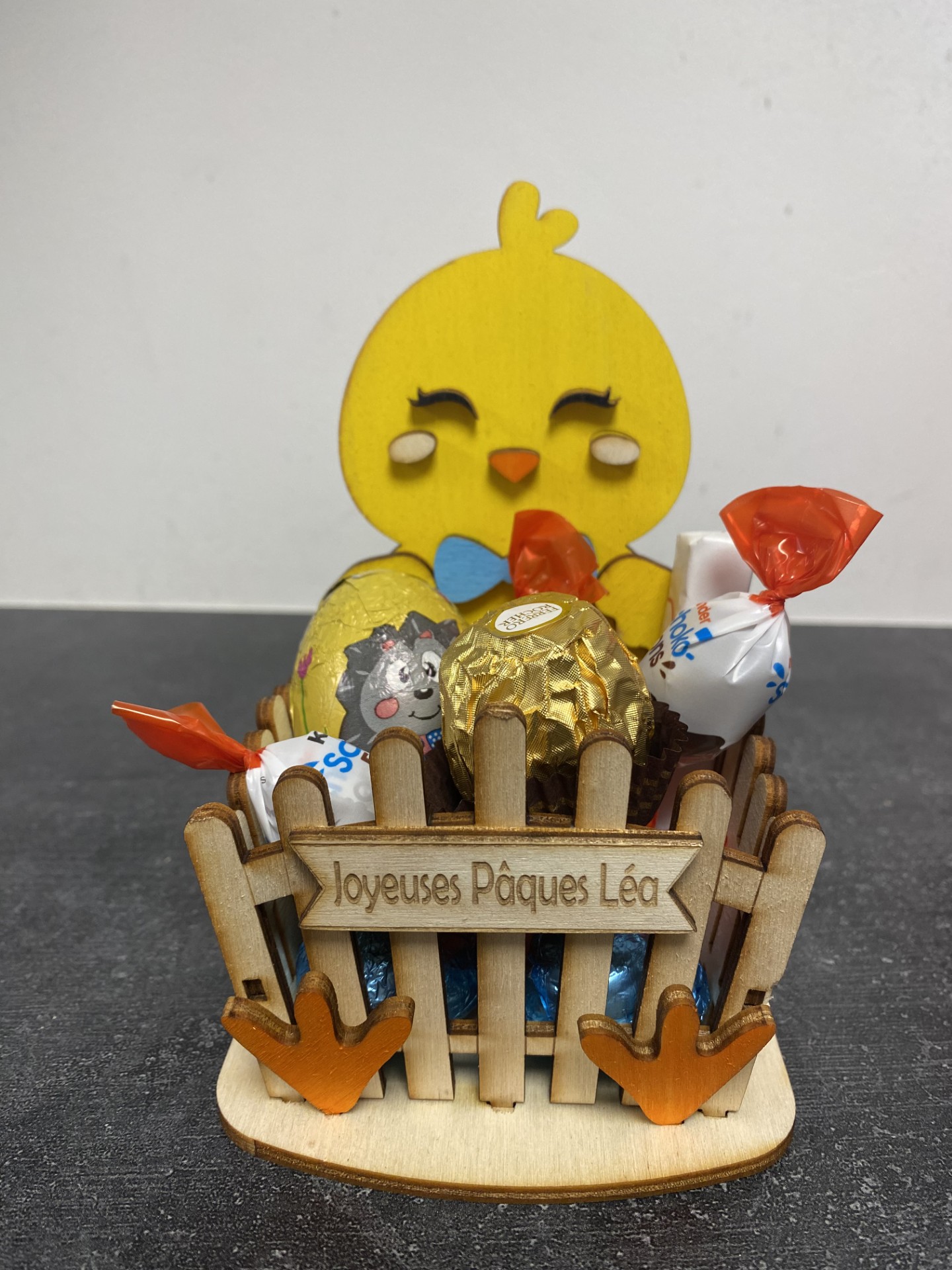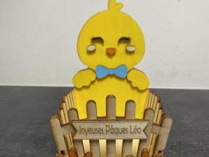 Un joli poussin avec son panier fabriqué en bois.
