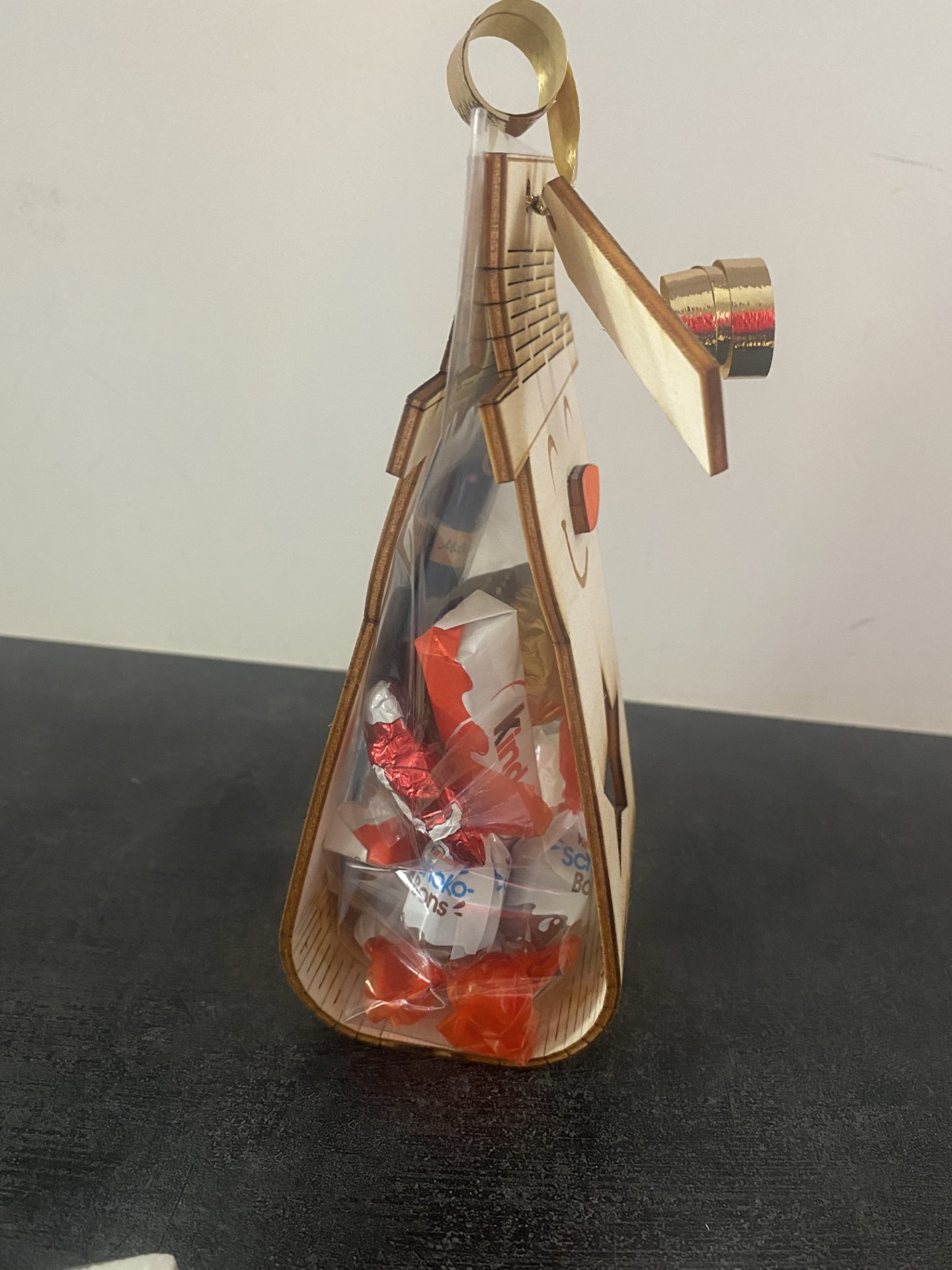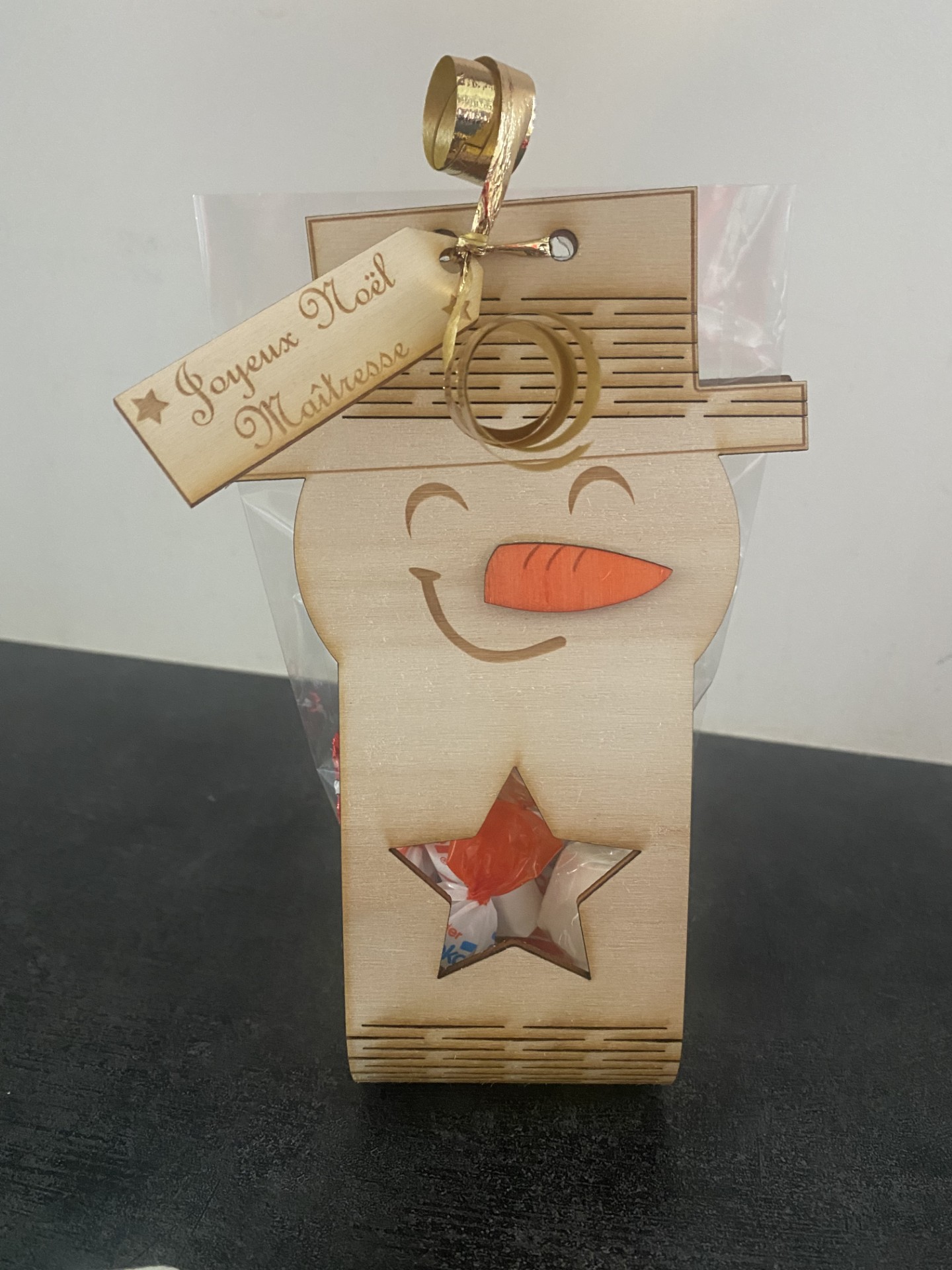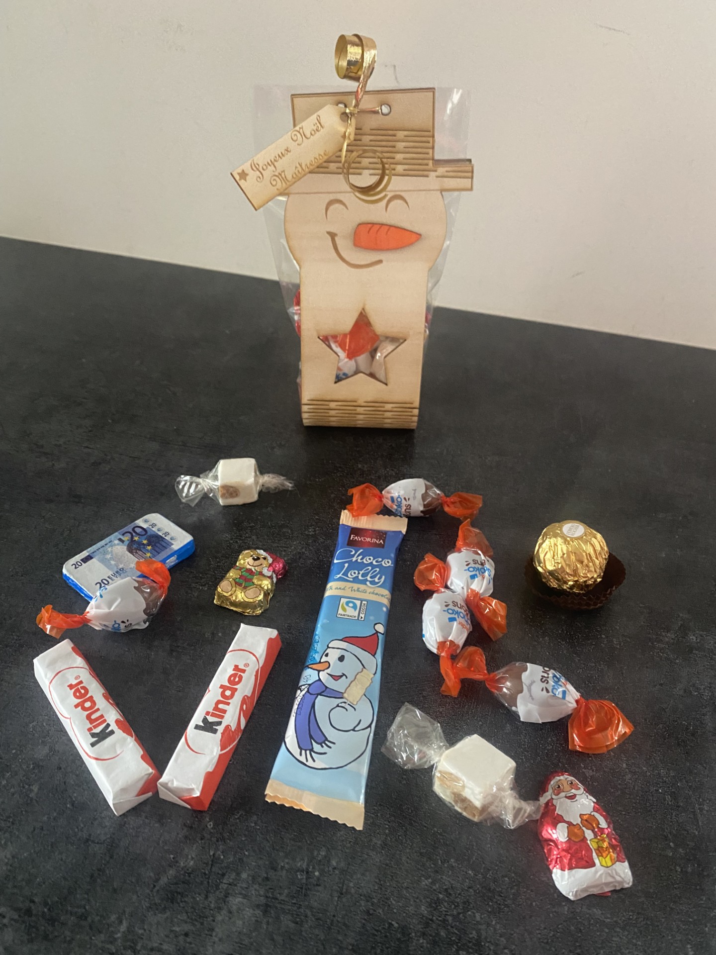 Un joli Bonhomme de neige en bois avec son petit sachet de chocolat