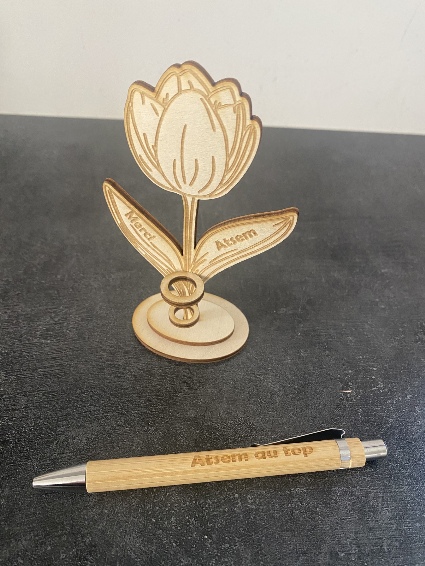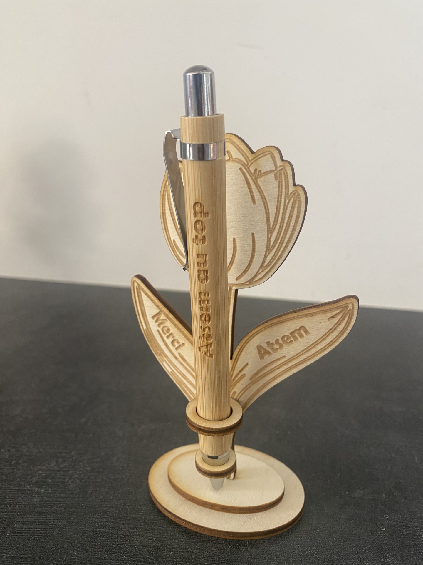 Le stylo en bambou, vous pouvez y changer totalement le texte.