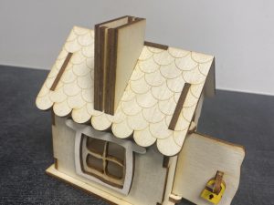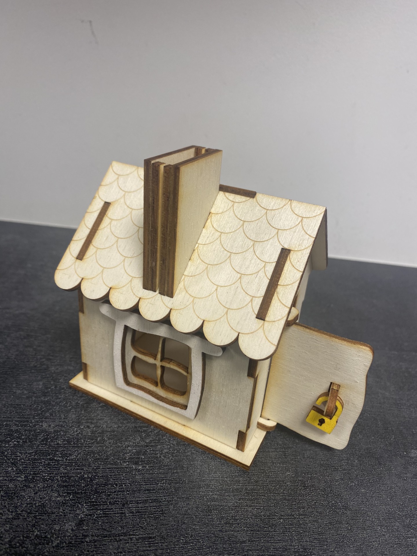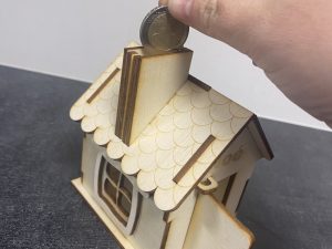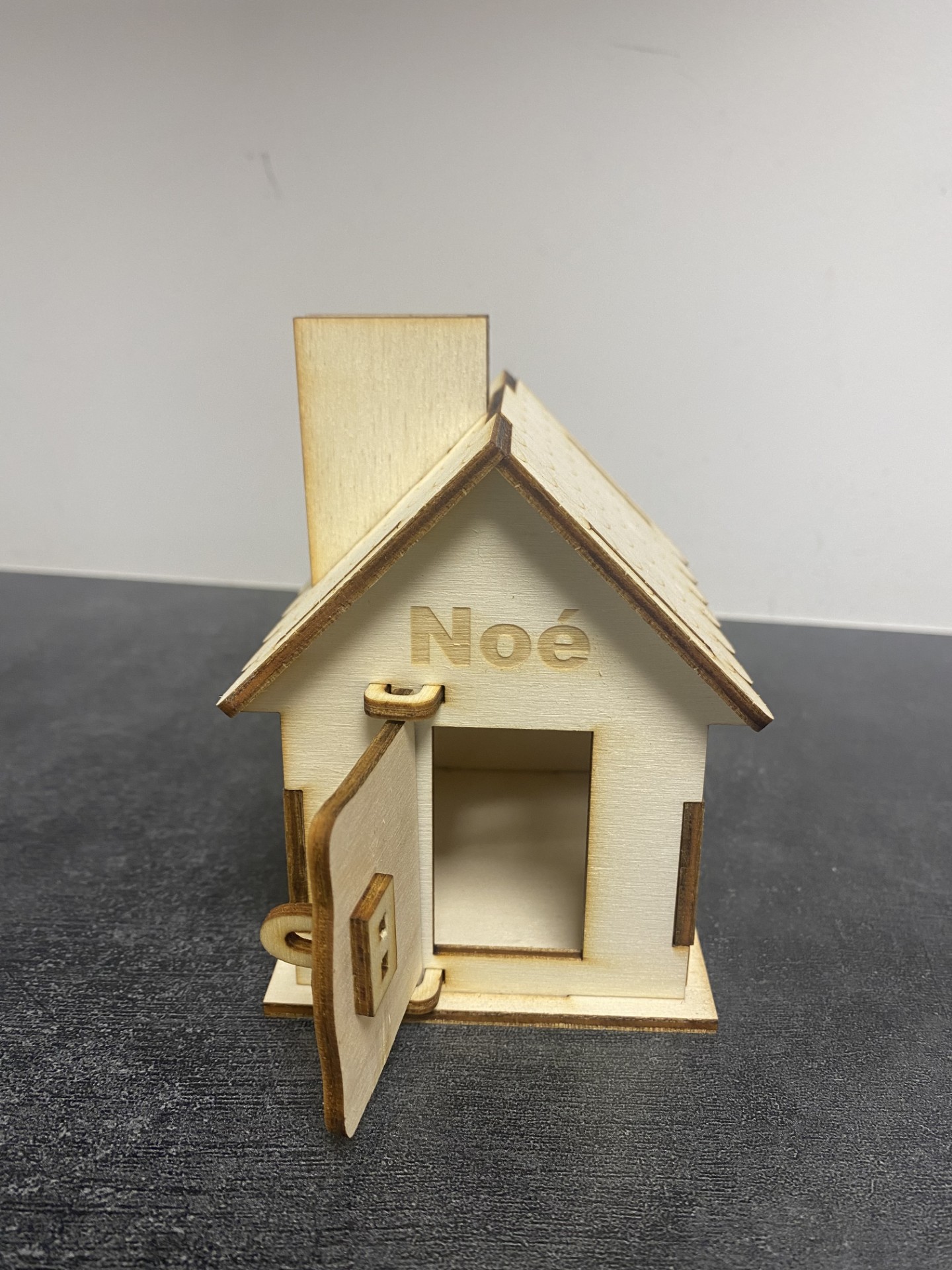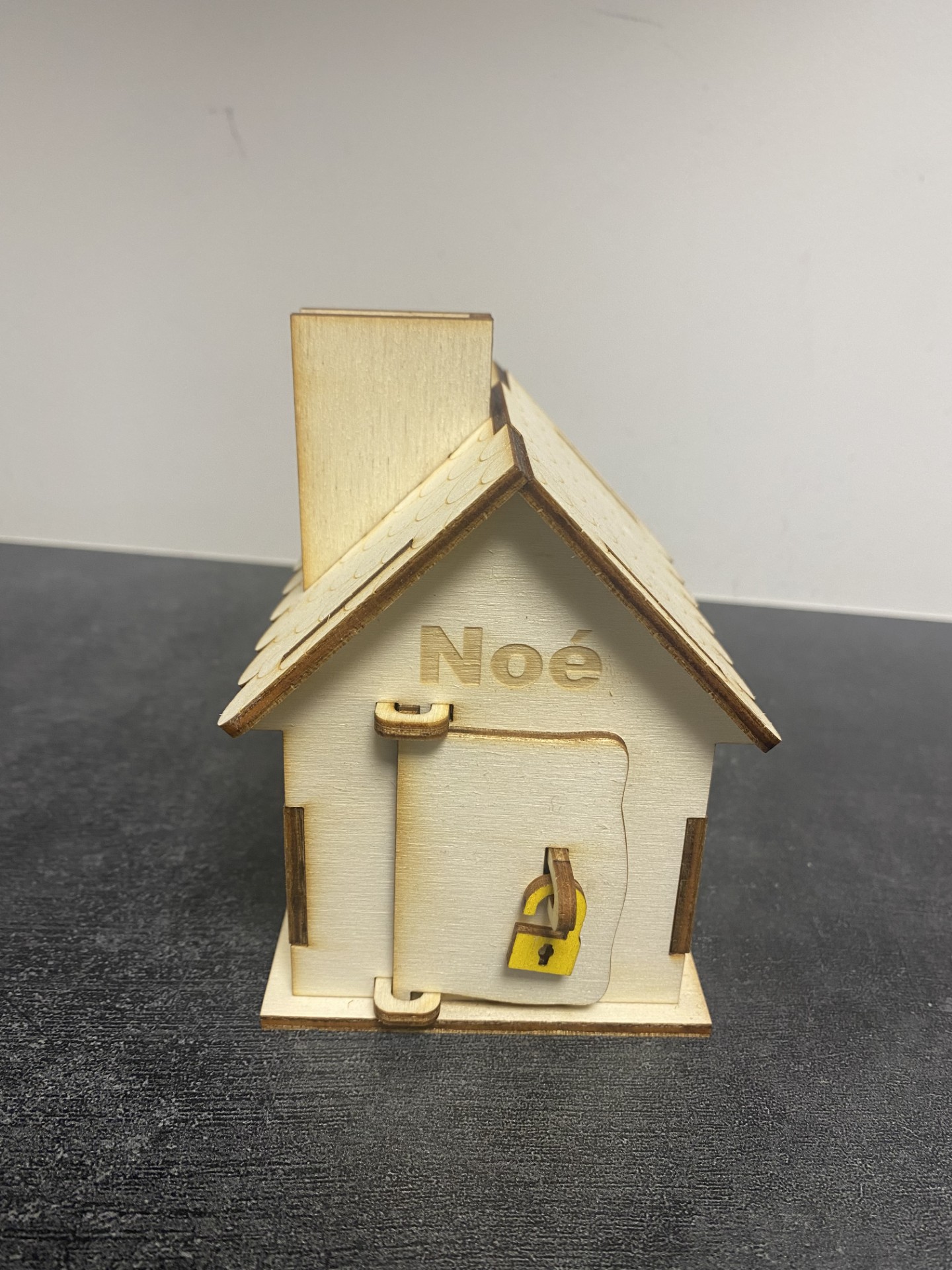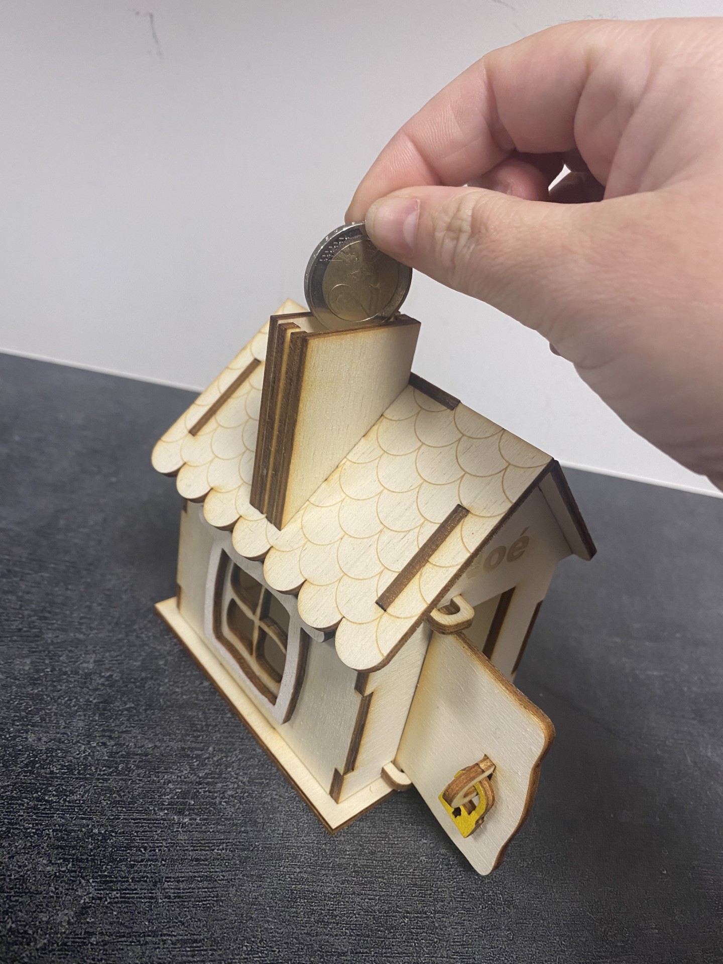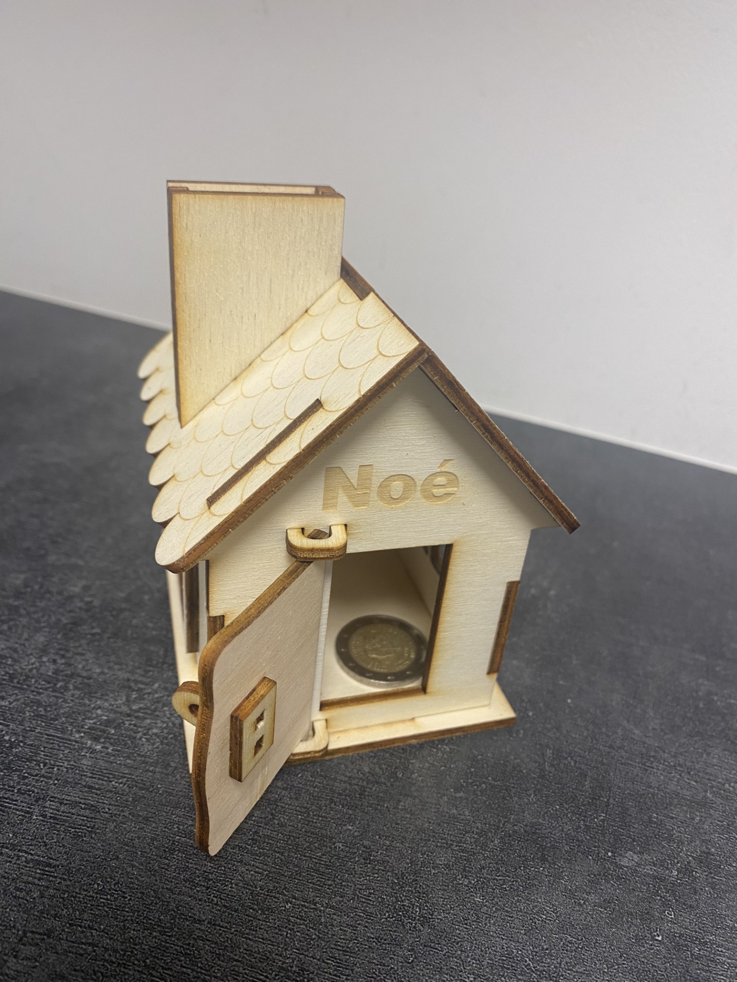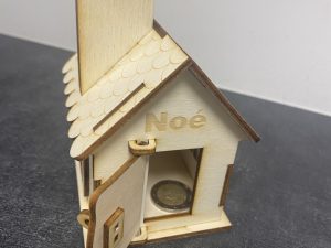 Un joli chalet en bois en forme de tirelire avec le prénom de l’enfant.